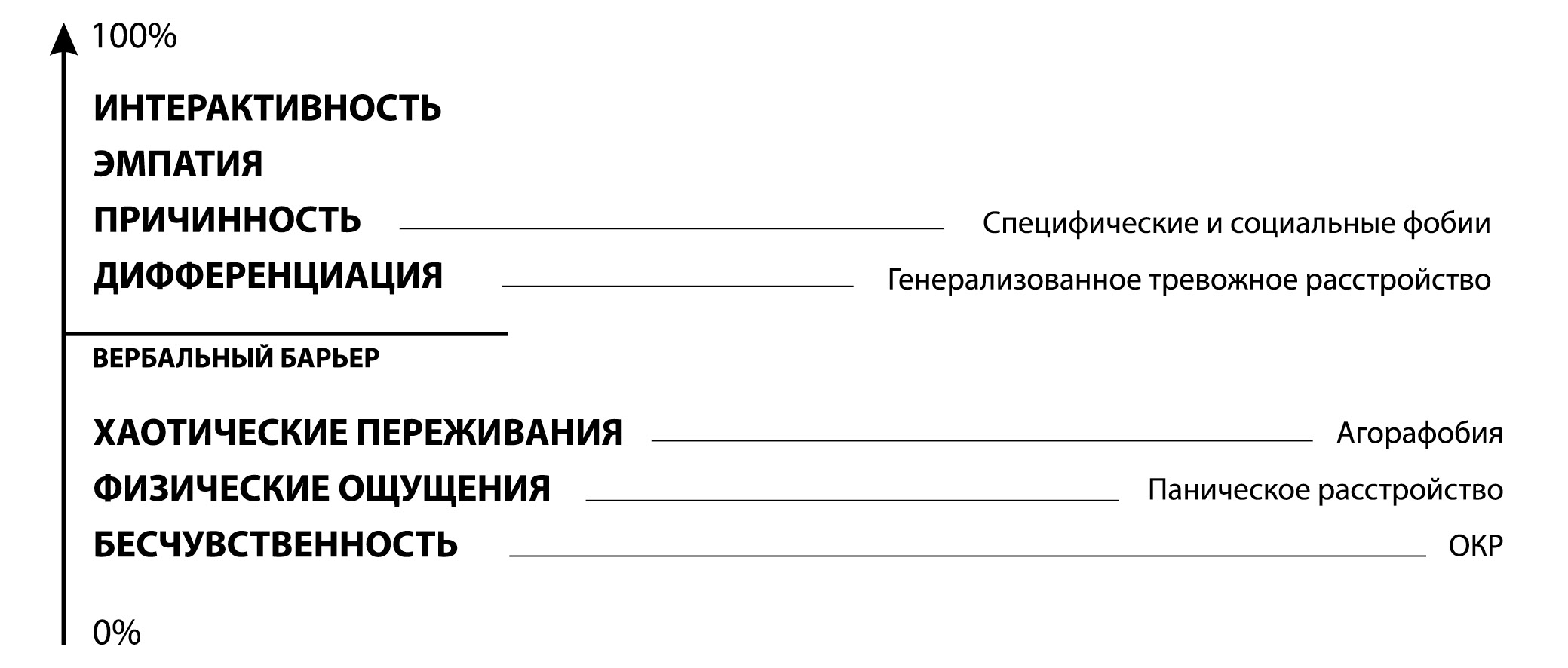 На данном рисунке наглядно представлено то, каким образом предварительный и обучающий тренер Транзактного анализа в области психотерапии (PTSTA (p)) Анна Головань в материалах семинара «ОКР и тревожные расстройства» (2020) соотносит тревожные расстройства со Шкалой эмоциональной грамотности Клода Штайнера (Steiner, 2016). А. Головань объясняет связь уровней развития эмоциональной грамотности с тревожными расстройствами личности следующим образом: