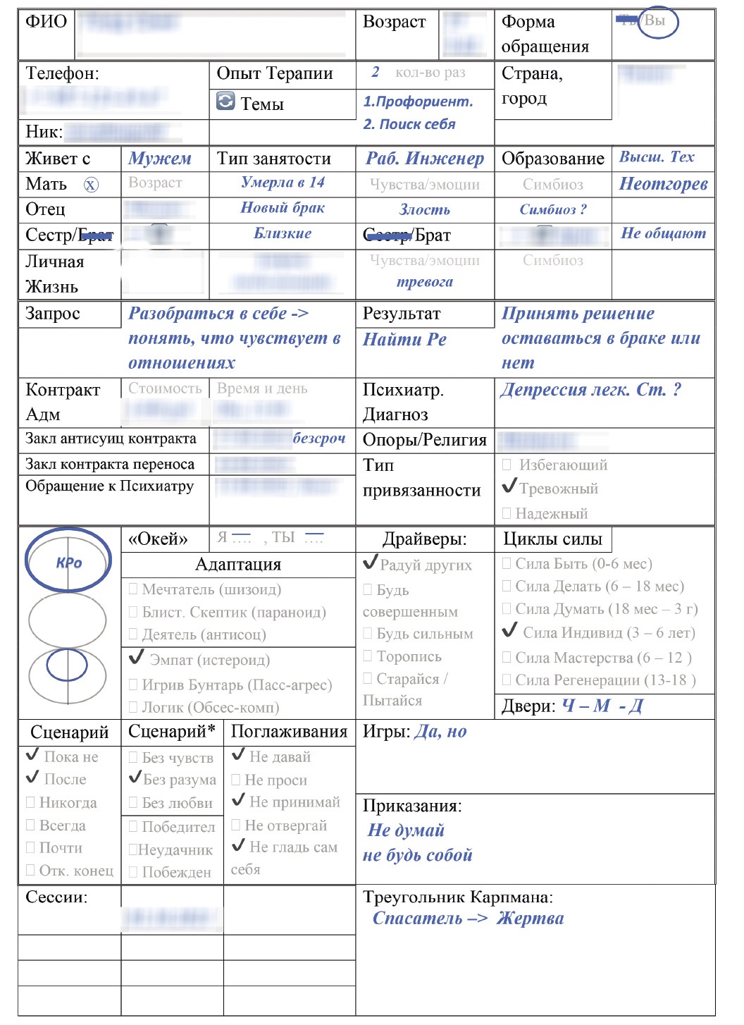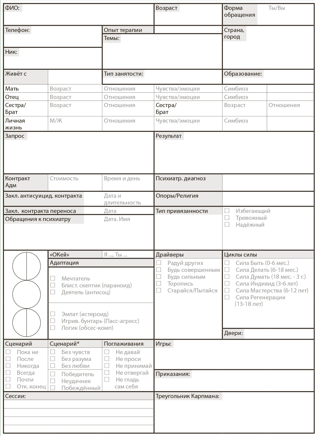The article presents the author’s view on the questions: how to keep records of basic information about the client so that you can quickly and briefly comment on each case? Is it possible to fit all the main transactional analytical models on one sheet? This article presents the results of a theoretical correlation of transactional analytical models and concepts in the form of a client profile for specialists in the Transactional Analysis modality. Comments on filling out the form are provided as a quick diagnostic of the client. The proposed form of maintenance will help specialists to structure the main data and knowledge about the client.
