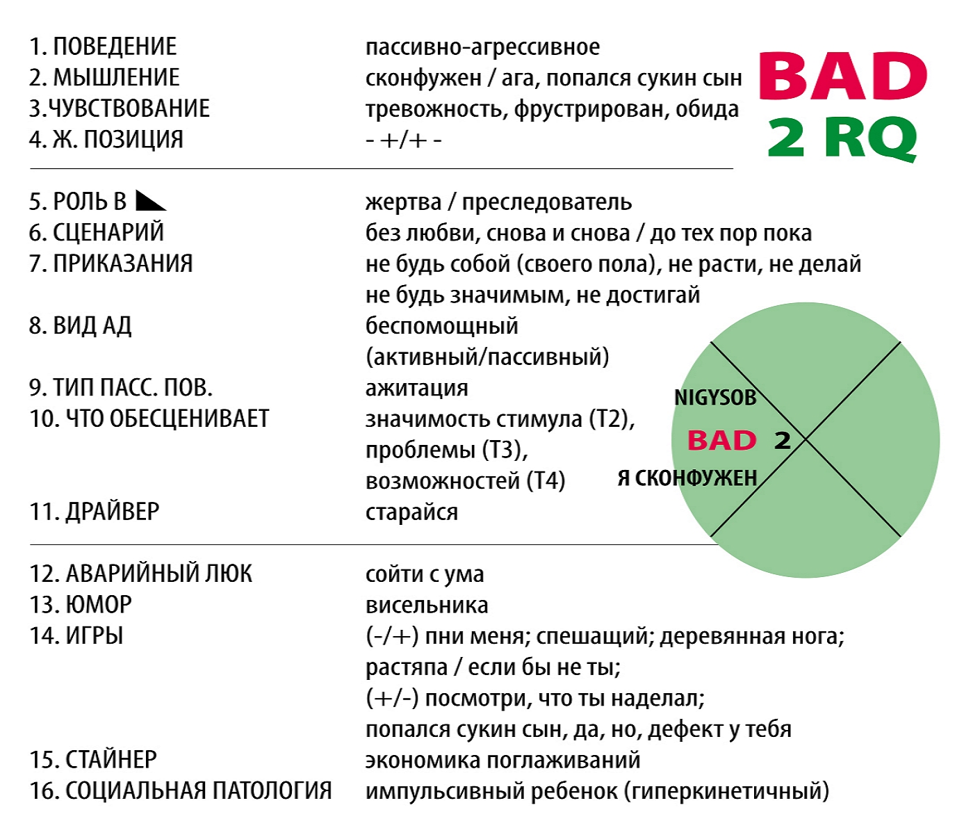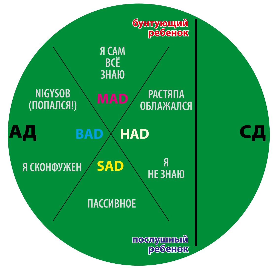 Заключительный четвертый квадрант (рис. 5) рэкета Эдвард Зерин располагает на противоположном полюсе эллипса: дихотомично пассивности там располагается агрессивный ребенок, Бунтующее дитя (АД-), которого наиболее точно в диагностической карте, на мой взгляд, описывает тип пассивного поведения — насилие/инвалидизация и социальная патология «ребенок после абьюза».