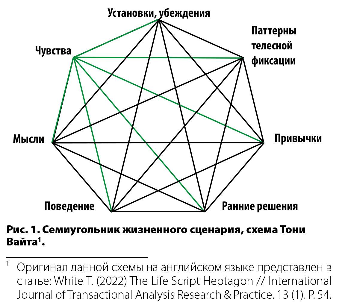 1Оригинал данной схемы на английском языке представлен в статье: White T. (2022) The Life Script Heptagon // International Journal of Transactional Analysis Research & Practice. 13 (1). P. 54.