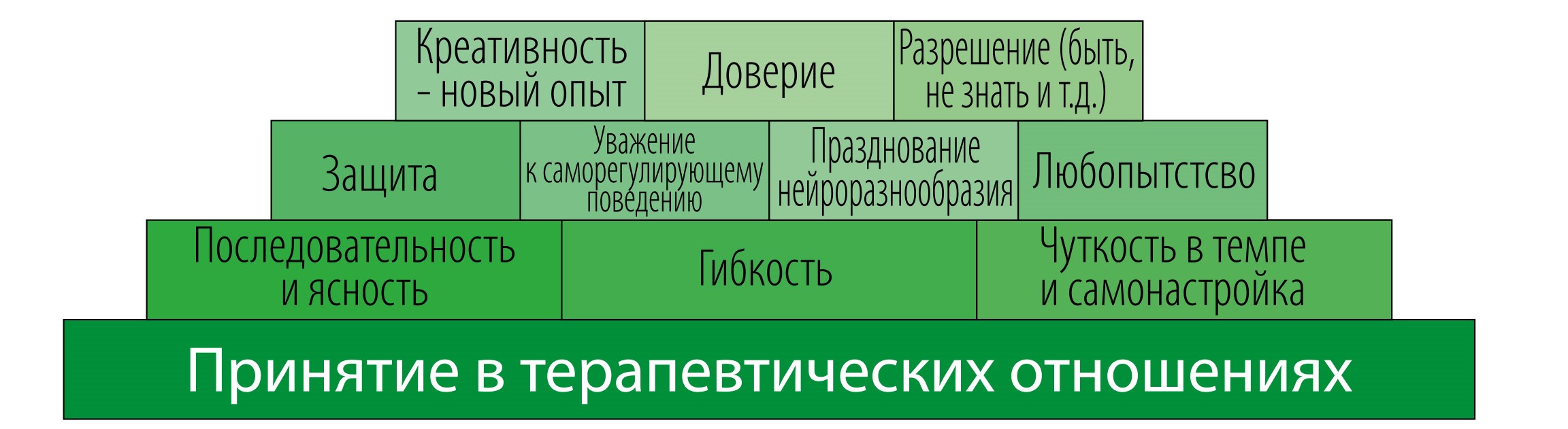 Акцент психотерапии клиентов с нейроотличиями строится на фундаменте терапии отношениями и необходимость баланса между приемлемой заботой и приемлемой структурой.
