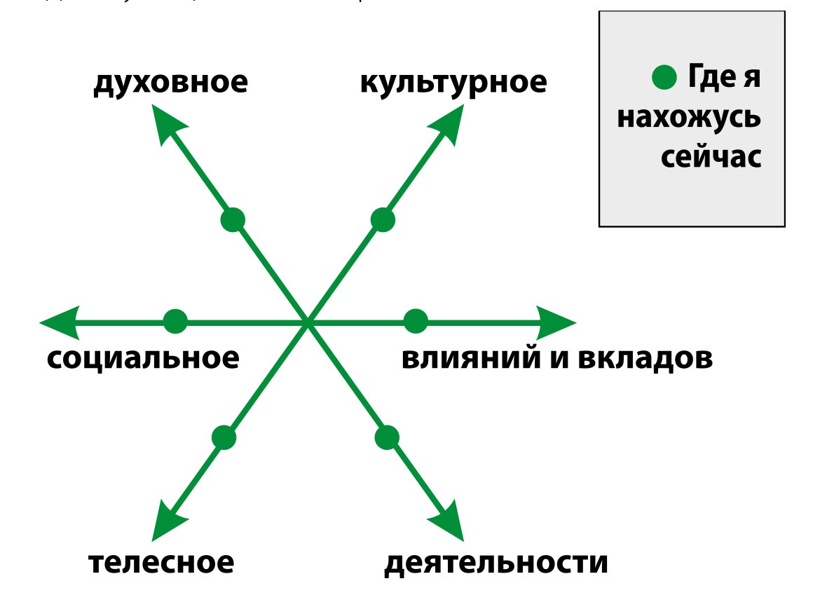 - Задавая себе вопрос «где я сейчас в этом пространстве» — «насколько это пространство развито, насколько вы им удовлетворены», ставим точку на каждом луче цветом номер 1.