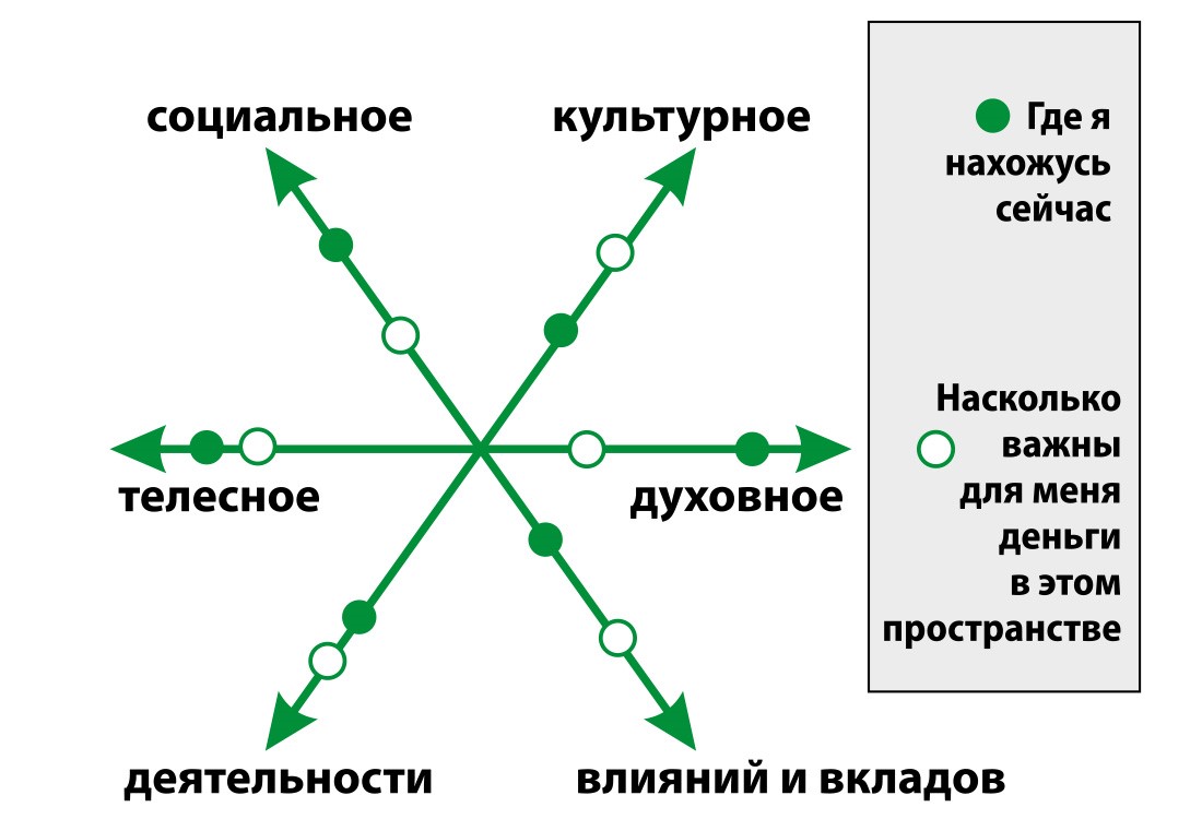 На мой взгляд, деньги пронизывают так или иначе все пространства личности, включая, пусть и в небольшой степени, даже духовное пространство и пространство Высшего. Например, для того чтобы читать духовную литературу, ее нужно купить или просмотреть с заранее купленного компьютера или телефона (оплатив связь); для того чтобы поехать в место, где мы можем прикоснуться к важному душой, тоже нужны средства (пространства духовного и Высшего). Мы платим также за билеты на концерты или в музеи как за способы приобщения к культуре; за участие в совместных мероприятиях, связанных с культурой нации (например, входной билет на фестиваль или оплата сувениров на нем), культурой семьи (например, оплата совместного выезда расширенной семьей на отдых — потому что так принято в нашей семье, такова наша культура) (культурное пространство). Мы платим за одежду, еду, спортзал, врачей (пространство телесного). А иногда эти же категории могут относиться к пространству деятельности или социальному пространству — в том случае, если, к примеру, мы оплачиваем одежду, чтобы вид был более профессиональный, или еду, оплаченную на совместном мероприятии, когда обед становится не просто средством насыщения, а полем общения и налаживания связей. Деньги в пространстве деятельности — это также мера оплаты нашего труда, а с другой стороны — это может быть еще и стоимость наших хобби. «Внутреннее пространство и трансличностное пространство также чаще всего включают в себя компоненту денег (“я богат”, “я беден”, “я могу себе это позволить”, “мои вещи выглядят дорого” и т.п.); пространство влияний и вкладов также пронизано финансовым обеспечением (например, возможностями распространения влияний и вкладов личности в обществе)» (Дорошенко, с. 48).