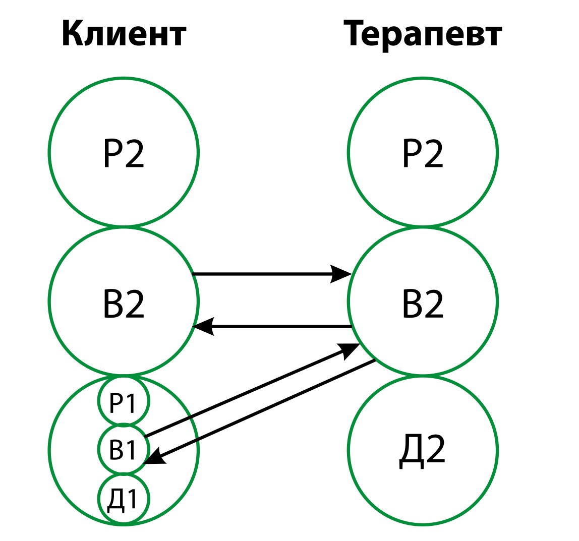 С точки зрения эго-состояний, техника направлена на активное участие Ребенка, части «Маленький профессор», где содержатся интуиция и первый предвестник Взрослого эго-состояния. При этом важно использовать функциональную часть Ребенка терапевта, проявляя любопытство к рисунку клиента: «Интересно, на что это похоже?»; «А вот тут у вас что?»; «Ого, какая разница между желаемым и сегодняшней ситуацией! Про что это, скорее всего?» и т.п. Взаимодействие Терапевта и Клиента в этой технике изображено на рисунке 7.