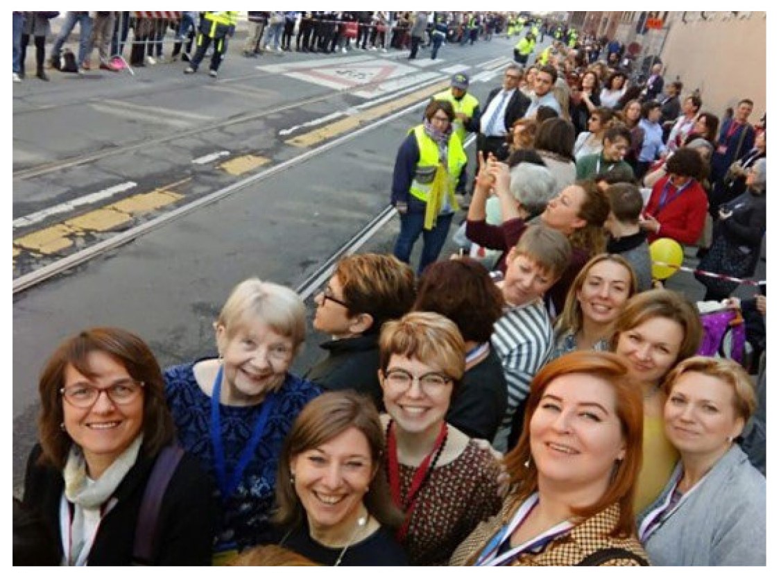 9. A very symbolic photo about group dynamics and initiation of unification: a photo from Richard Erskine's conference in Milan "The Healing Relationship: Body, Mind & Spirit" (23-24.03.2017), where all the TA-students are waiting for the Pope instead of training. In the photo you can recognize Elena Rechkina, Olga Tuchina and Marye O'Reilly-Knapp (TSTA)