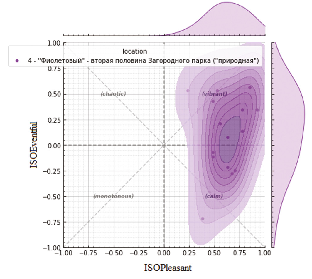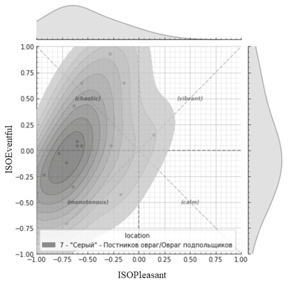 По прохождению всеми информантами анкетирования был проведен анализ ответов, касающихся испытываемых впечатлений и эмоций от окружающих звуков. Была написана программа на языке Python, которая с помощью библиотеки «Soundscapy», предназначенной именно для оценки звукового ландшафта, позволяет визуализировать данные и интерпретировать их [5].