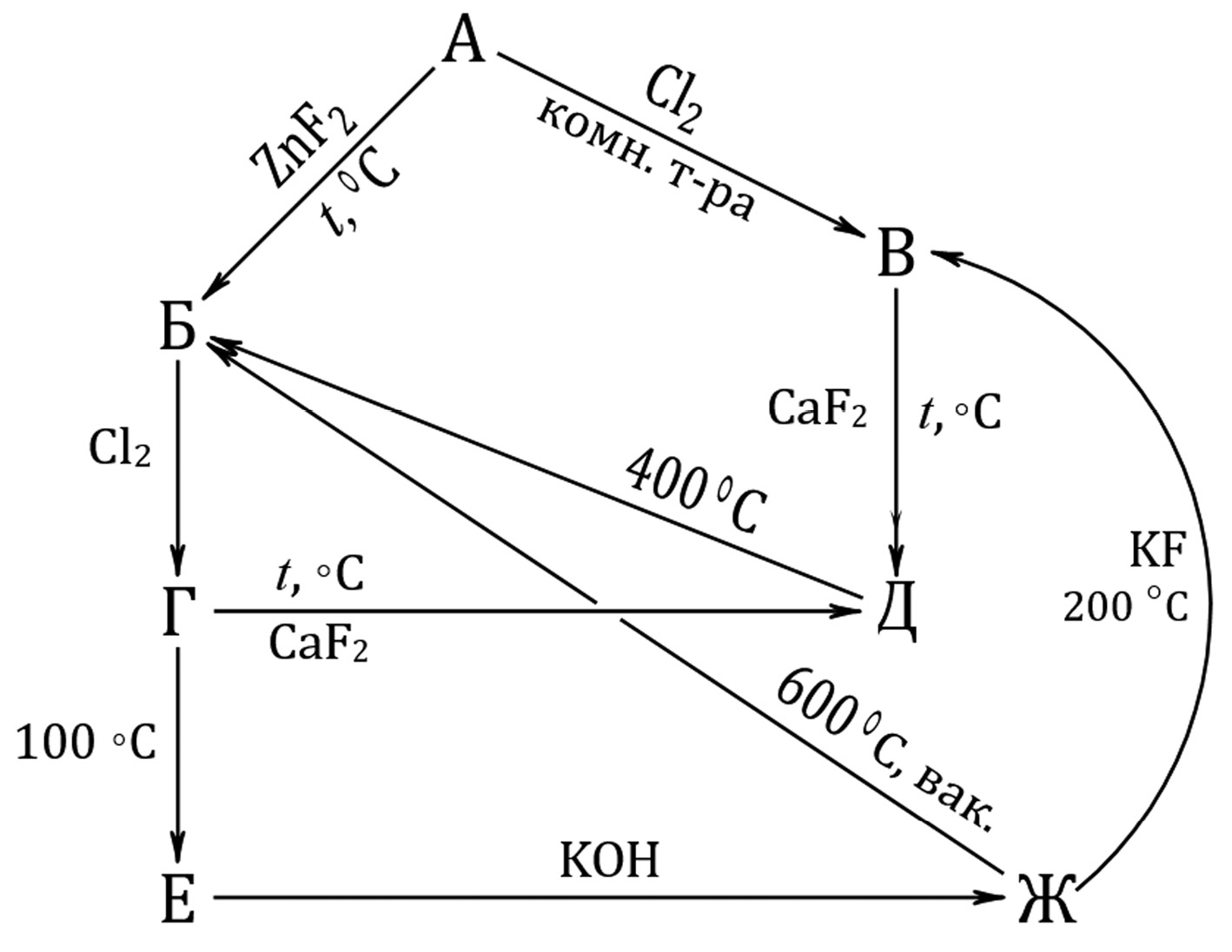 Расшифруйте схему превращений (рис. 1). Все вещества, обозначенные русскими буквами, содержат элемент Х. Известно, что вещество Б с хлором реагирует в мольном соотношении 1 : 1, а прямая обработка вещества Г концентрированным KOH не приводит к Ж.